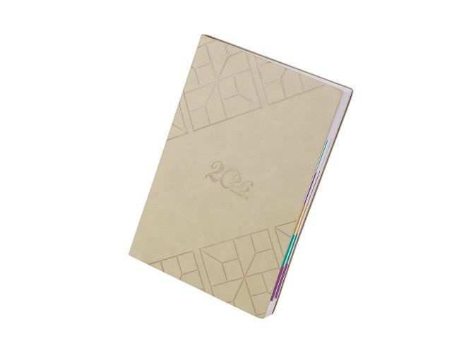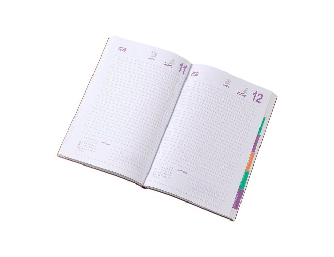 Agenda 2026 de couro sintético com abas mensais e marcador de página em cetim. Contém folhas para dados pessoais, calendários 2026 à 2028, planejamento 2026, DDI, página de conversões e páginas de contatos.