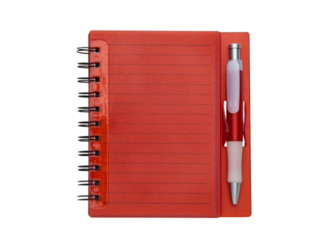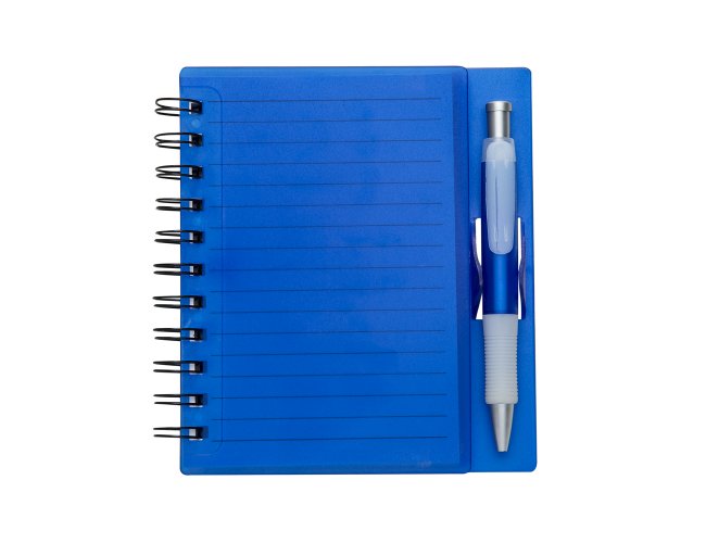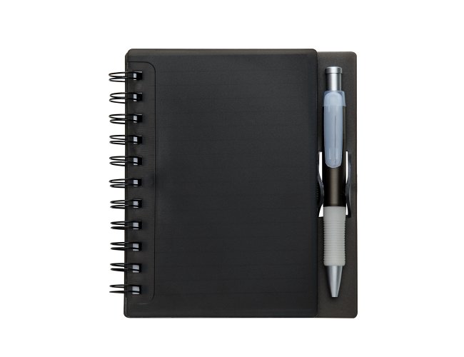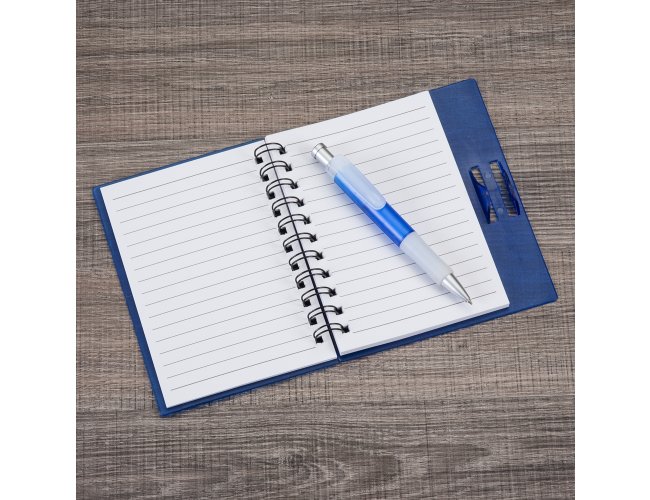 Caderno plástico wire-o com caneta e suporte para encaixe. Caneta plástica com detalhe emborrachado, carga esferográfica na cor azul e acionamento por clique.