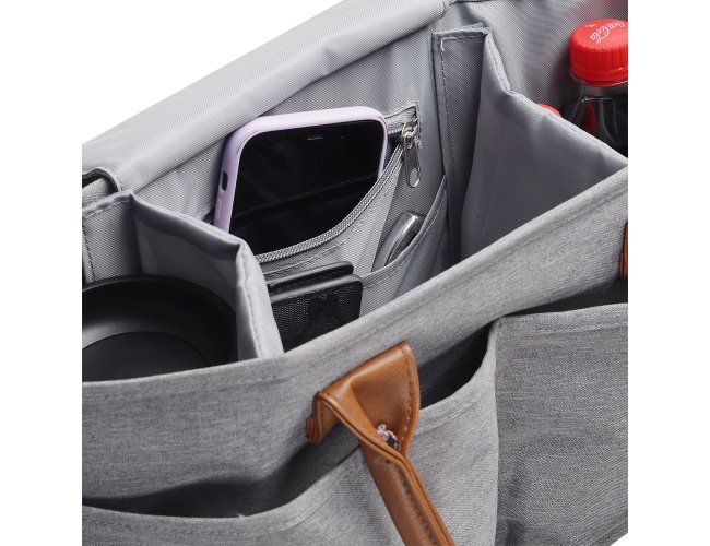 Bolsa Multifuncional em poliéster 300D com detalhes em PU e interior em 210D, possui 5 compartimentos externos. Conta com alças de ombro e mão em PU, engate para carrinho de bebê e velcro para fechamento interno. O interior oferece 5 divisórias removíveis, sendo uma com zíper e uma com tecido térmico, proporcionando praticidade e organização.