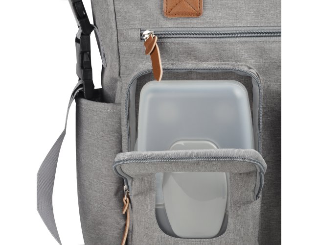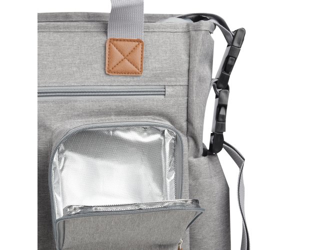 Bolsa multifuncional em poliéster 300D com detalhes em PU e interior em 210D. Possui 2 compartimentos laterais, 3 bolsos frontais com zíper, 1 na parte oposta com fechamento em velcro, incluindo um específico para lenços umedecidos.