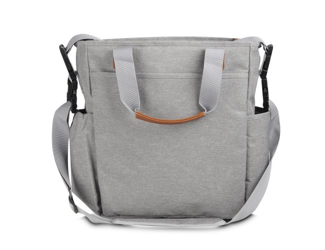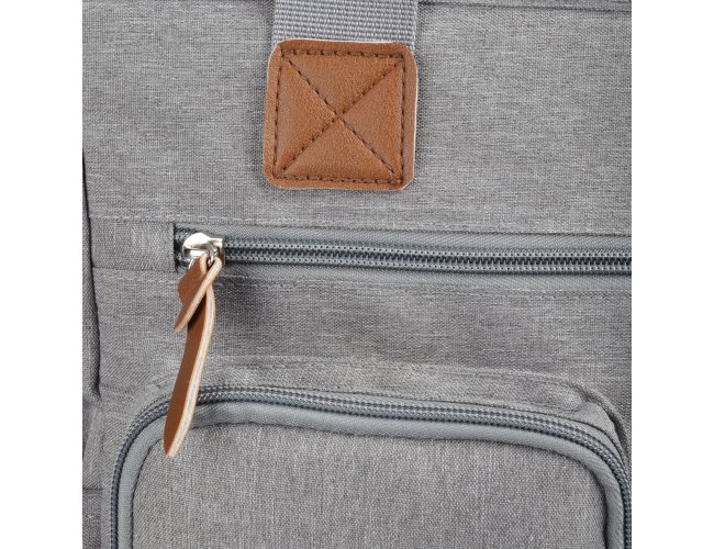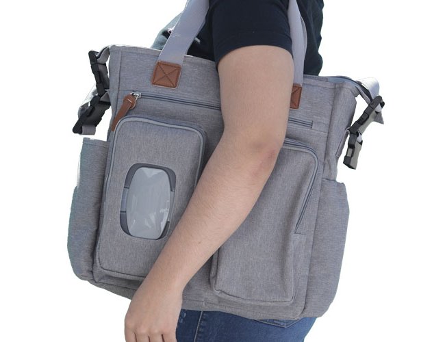 Bolsa multifuncional em poliéster 300D com detalhes em PU e interior em 210D. Possui 2 compartimentos laterais, 3 bolsos frontais com zíper, 1 na parte oposta com fechamento em velcro, incluindo um específico para lenços umedecidos. Conta com alças de ombro e de mão com acabamento em PU, além de interior espaçoso com divisórias e fechamento em zíper. Prática e organizada para o dia a dia.