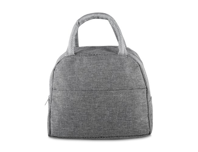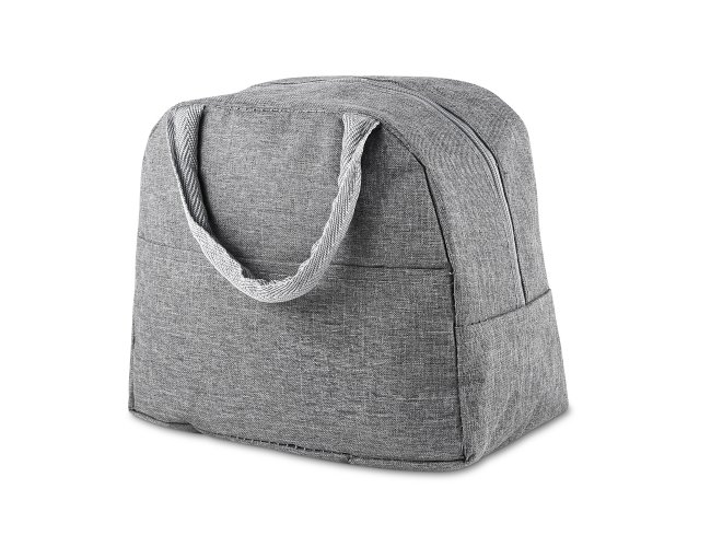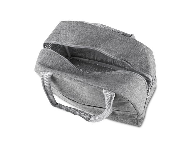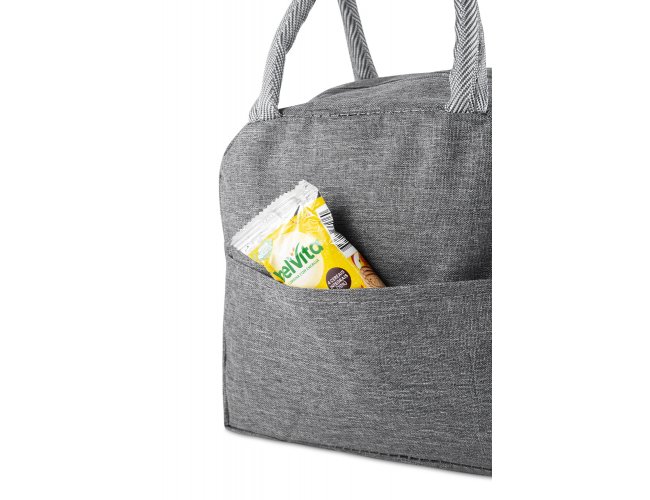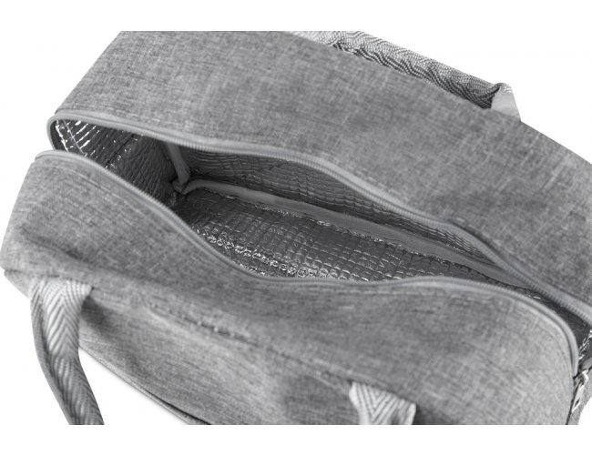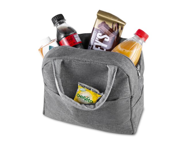Bolsa térmica costurada, confeccionada em poliéster 300D na parte externa e manta térmica no interior. Modelo sem solda, com bolso frontal e capacidade para 5 litros.