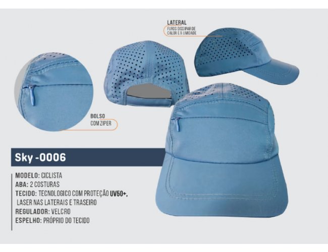 Modelo: Ciclista Aba: 2 costuras Tecido: Tecnológico com proteção UV50+ Laterais e traseiro: Laser Regulador: Velcro Espelho: Próprio do tecido