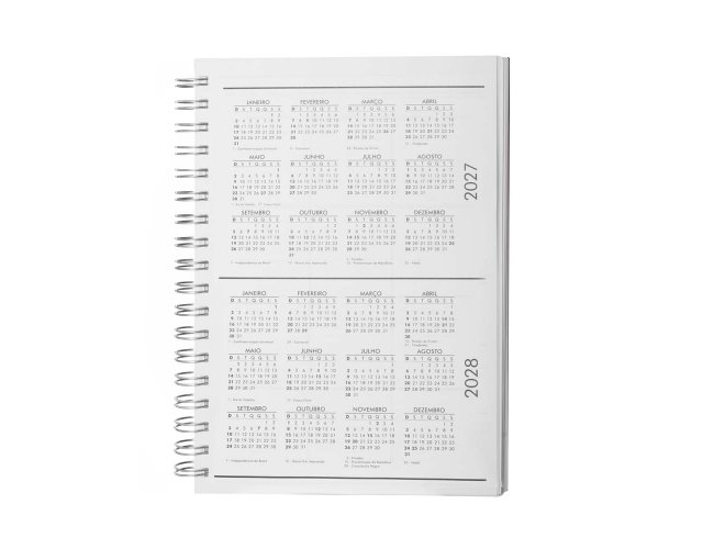 Contém folha de dados pessoais, folha com calendários de 2025 à 2028 e espaço para anotações mensais.