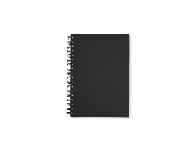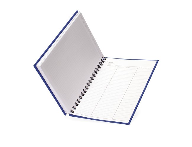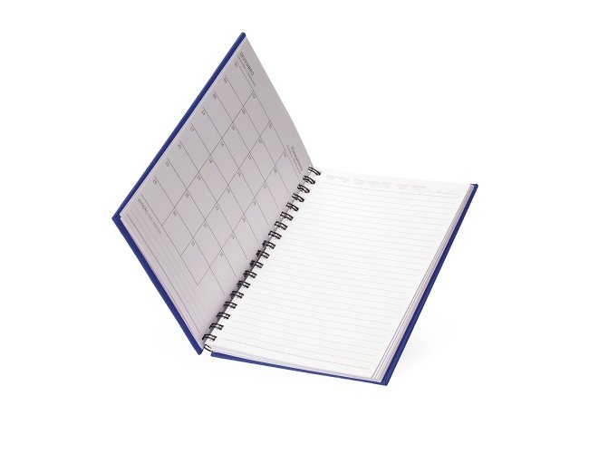 Caderno emborrachado de frente e verso lisa com espiral preto. Possui dados pessoais, calendário de 2025 à 2027, aproximadamente 100 folhas brancas pautadas com detalhe "data" na parte superior de cada folha.
