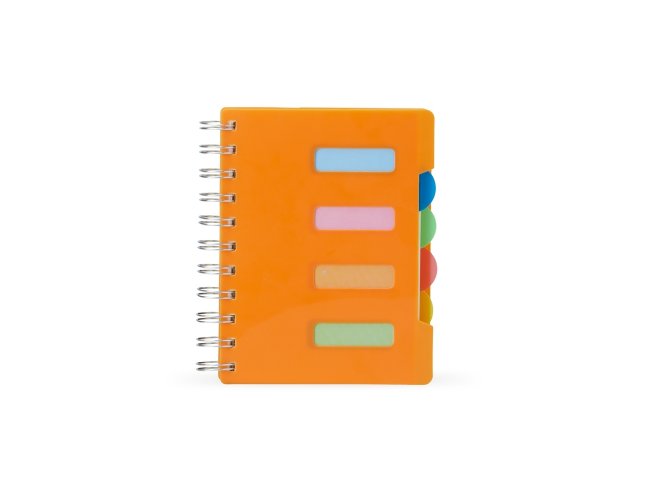 Caderno pequeno com 4 divisórias e abas para identificações, capa plástica com wire-o metálico.