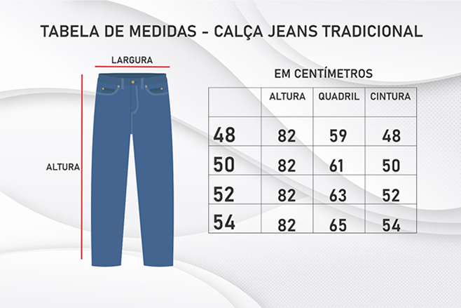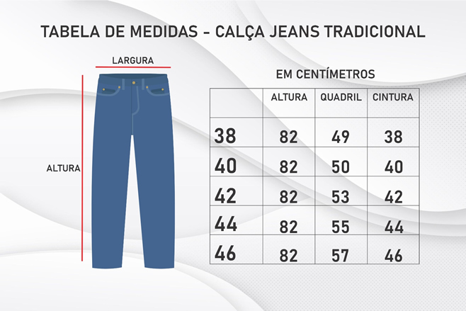 Calça Jeans Tradicional sem Lycra. Composição: 100% Algodão