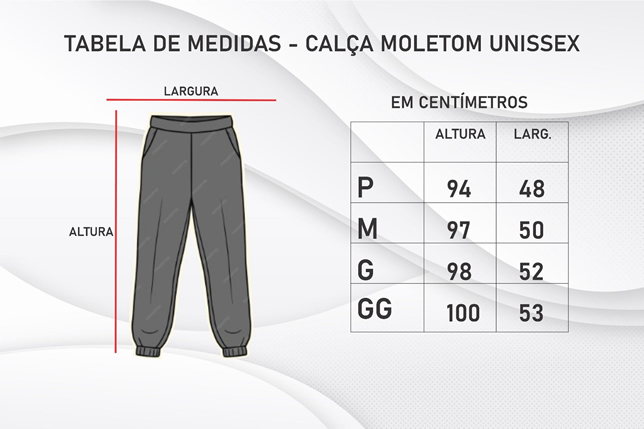 Calça Moletom Unissex C/ Punho e Elástico PA. Composição: 50% Algodão, 50% Poliéster
