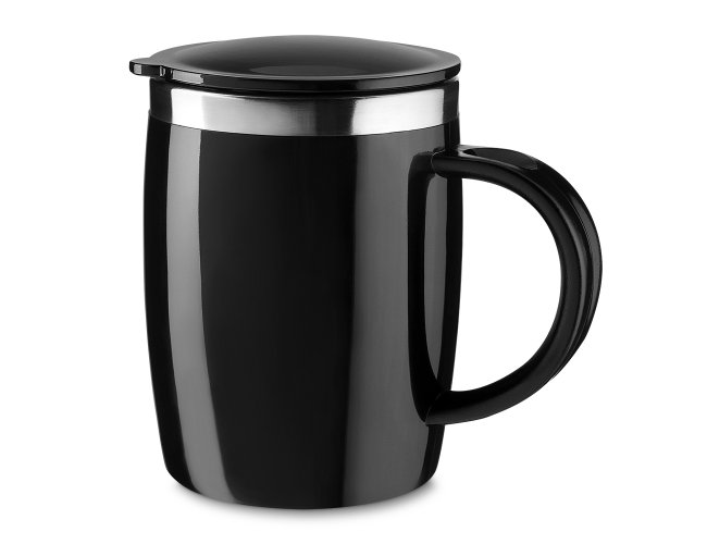 Caneca plástica com área interna em inox, com capacidade de 400ml. A caneca possui tampa de fechamento através de um encaixe feito por um anel de silicone.