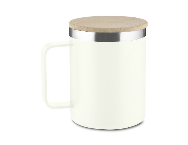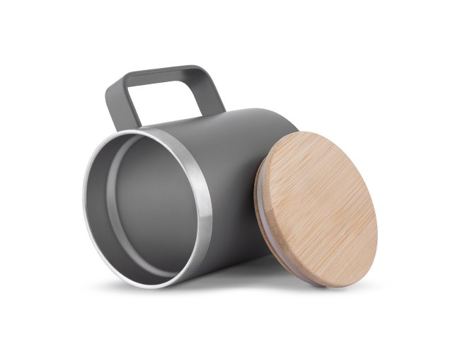 Caneca térmica 400ml, produzida em inox reciclado (304 interno / 201 externo), com tampa em bambu, pintura a pó.