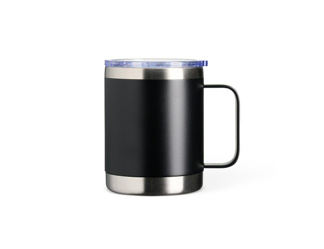 Caneca térmica de inox 350ml com parede dupla. Contém tampa acrílica com bocal e trava de segurança.