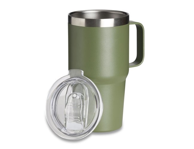 Caneca térmica de Inox com capacidade para 700ml. Acompanha uma tampa de plástico transparente .