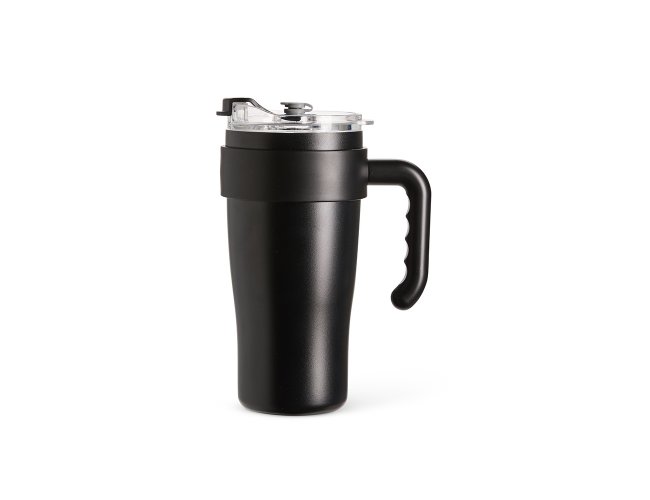 Caneca térmica em inox com capacidade máxima de 800ml. Possui estrutura em parede dupla, alça ergonômica em plástico, tampa rosqueável com vedação a vácuo, protetor para bocal e acesso para canudo com tampa em silicone.