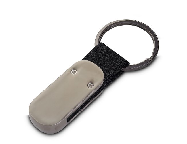 Chaveiro produzido em liga de zinco, ferro e poliéster.