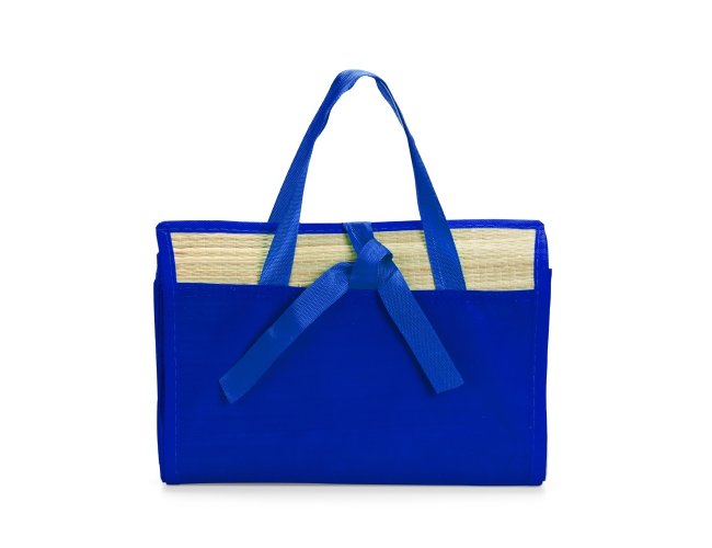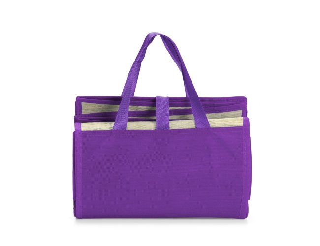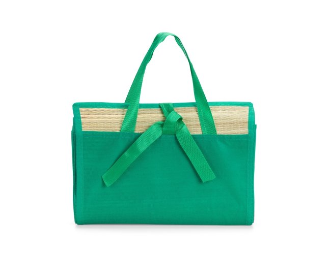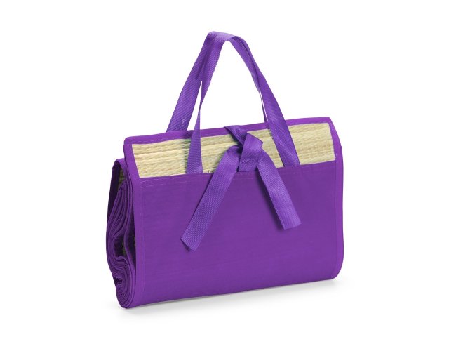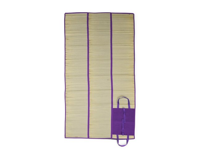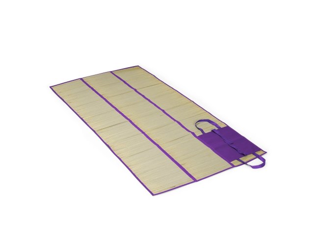 Esteira dobrável em palha natural com bordas costuradas em nylon dividindo a esteira em três partes. Além disso, possui um par de alças costuradas para transporte.
