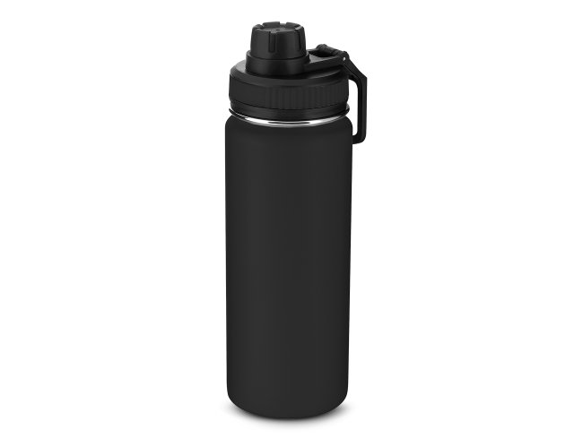 Garrafa em aço inox com capacidade de até 780 ml. Tampa rosqueável com anel de silicone, alça plástica em formato de mosquetão e bico rosqueável para fácil acesso. Design com frisos na tampa e pintura pó.