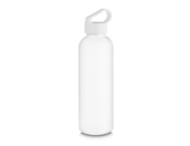 Garrafa *RPET com capacidade de 550ml. Tampa plástica rosqueável com alça de transporte integrada.