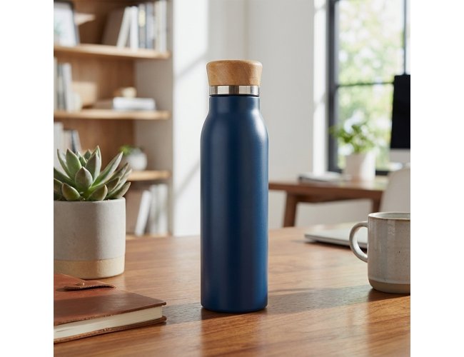 Garrafa térmica feita em inox com pintura em spray, tampa rosqueável em bambu e capacidade máxima de 600ml. Possui estrutura de parede dupla e isolamento a vácuo, permitindo manter a temperatura de líquidos por mais tempo.