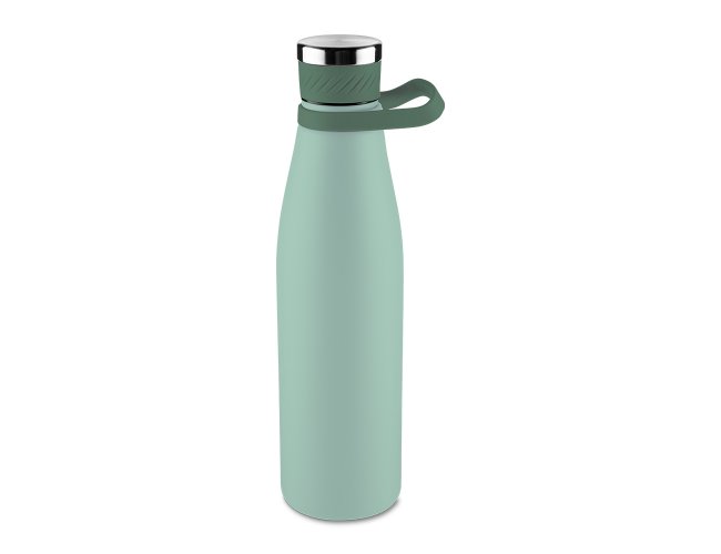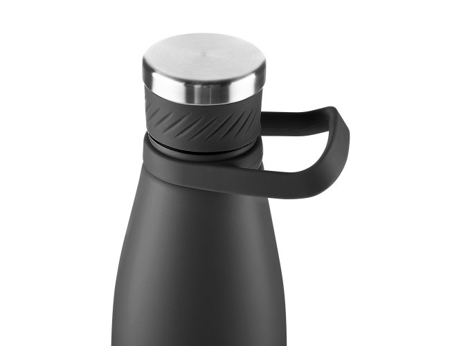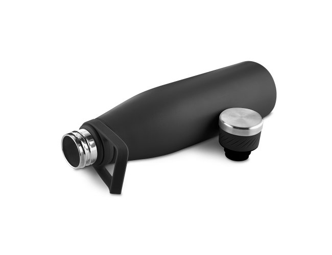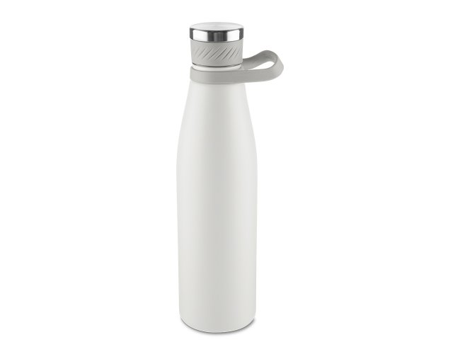 Garrafa térmica de 750 ml com parede dupla em inox (interno 304 / externo 201), acabamento com pintura a pó e tampa em inox 201 com anel de silicone para vedação, possui alça em silicone para transporte.