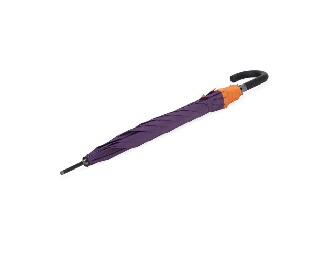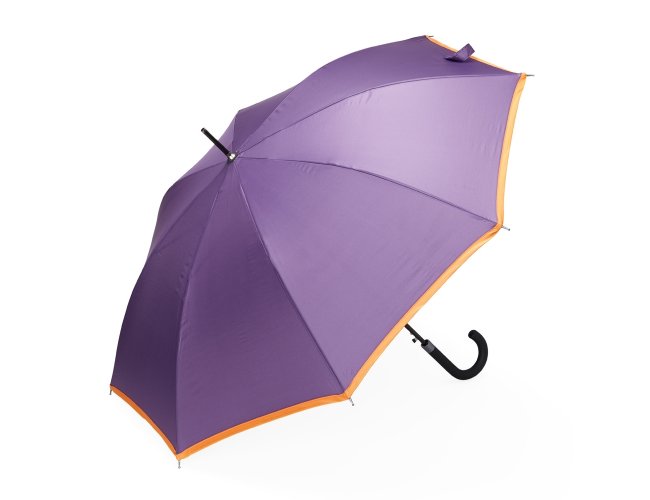 Guarda-chuva de poliéster de impacto impermeável com abertura automática, estrutura em aço e 8 varetas em fibra de vidro. Possui pegador plástico com botão de acionamento.