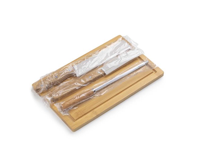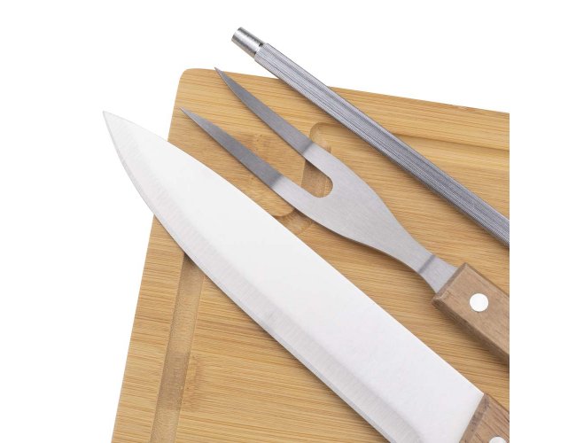 Kit churrasco com 4 peças: Garfo grande, Faca com 31,7 cm e uma Chaira, todos com cabos de madeira, ambos com cabos de madeira e lâminas em aço inox, e uma Tábua de bambu com 1,2 de espessura.