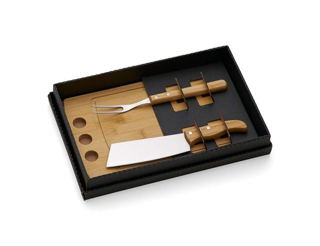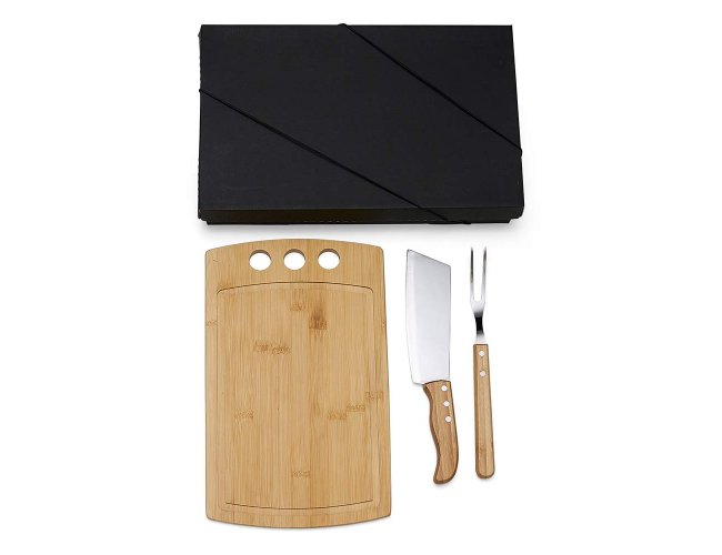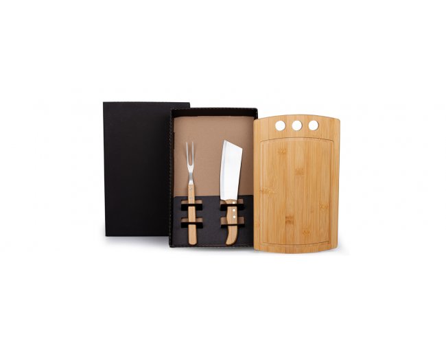 Composto por tábua com 3 furos em Bambu; cutelo e garfo em Madeira/Inox.
