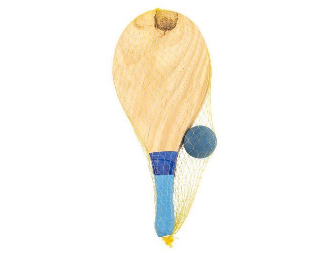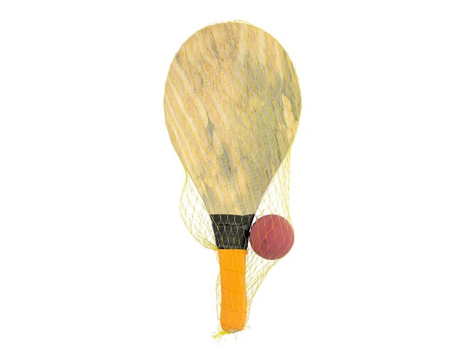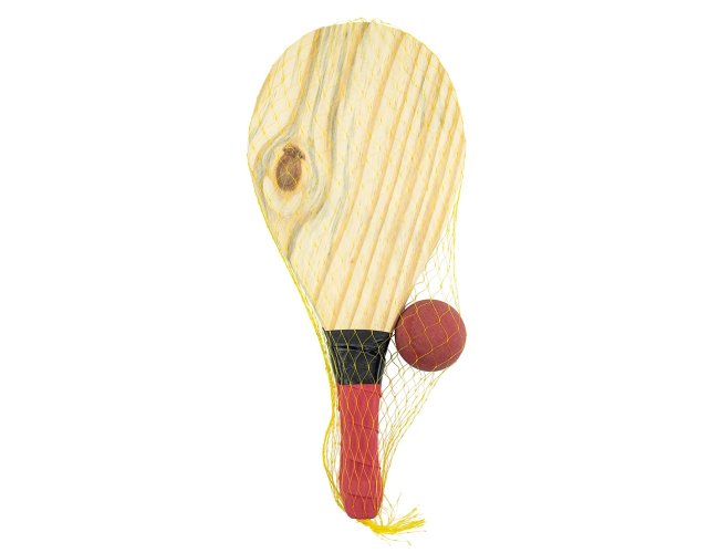 Kit frescobol com embalagem de malha plástica. Contém 2 raquetes de madeira com pegador de revestimento EVA e bolinha emborrachada.