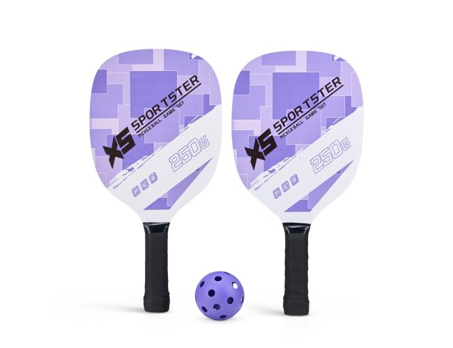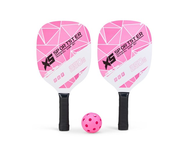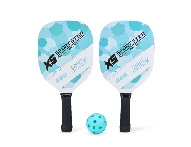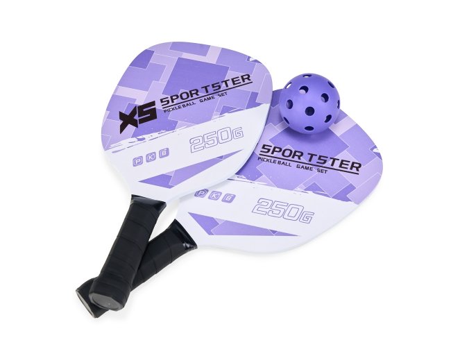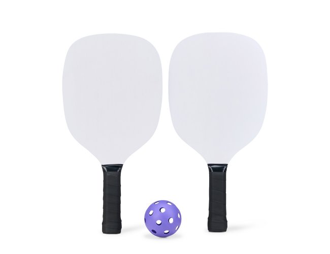 Kit Pickleball composto por 2 raquetes de madeira (sendo uma face personalizada e outra lisa), além de grip composto em fibras de carbono e vidro. Acompanha 1 bola plástica com 26 furos e um saco telado para transporte.