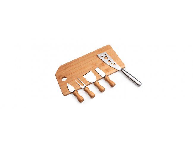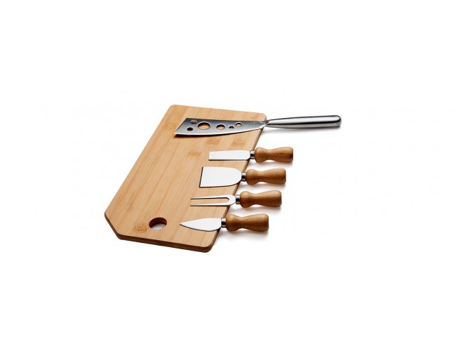 Conjunto para queijo em bambu/aço inox. Conta com tábua em bambu; Duas facas, sendo, uma com ponta e outra reta, garfo e espátula em madeira/inox; Faca para frios em metal. Acompanha embalagem kraft