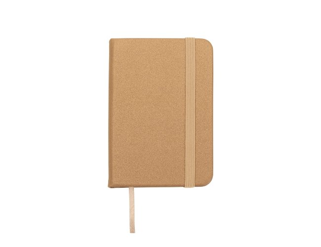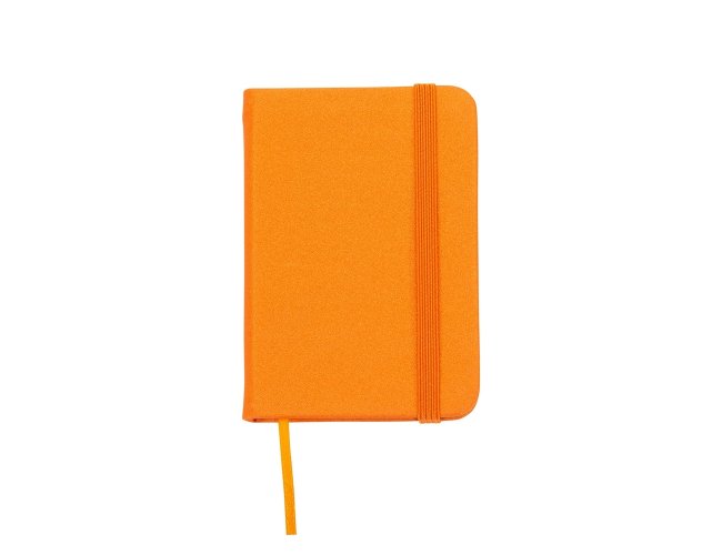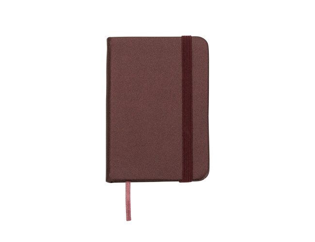 Mini Caderneta em material sintético brilhante com marcador de página em cetim e fita elástica para fechar. Contém aproximadamente 80 folhas amareladas sem pauta.
