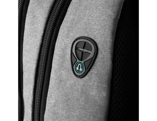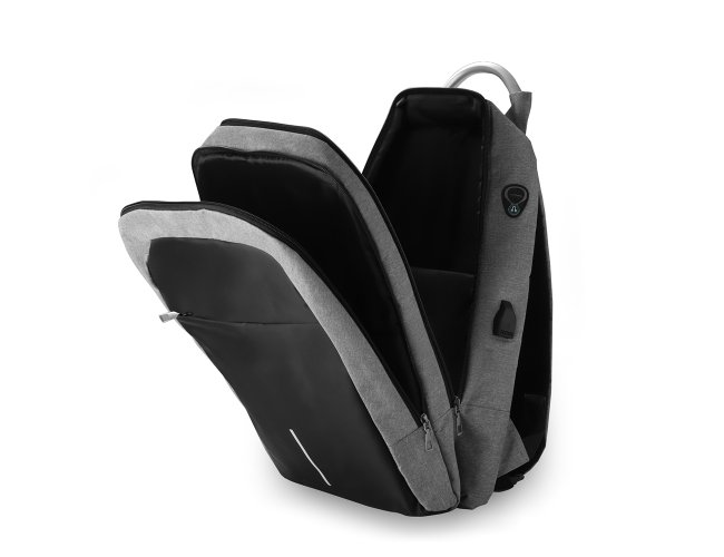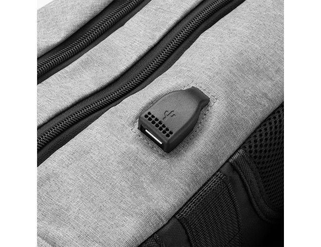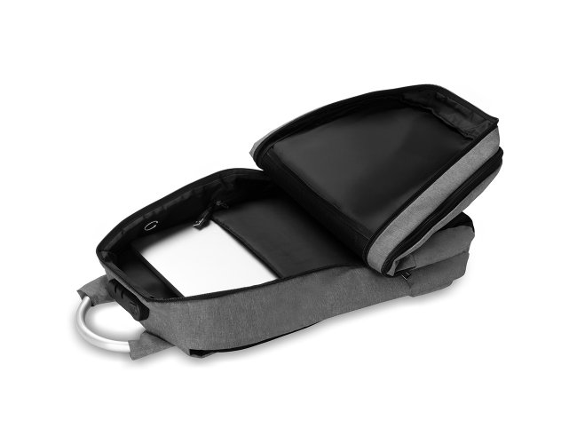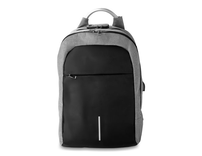 Mochila confeccionada em tecido externo de poliéster 300D e tecido interno em poliéster 210D. Possui fechamento em cadeado com segredo, bolso frontal com zíper, faixa reflexiva na parte frontal, saída USB e para fone de ouvido.