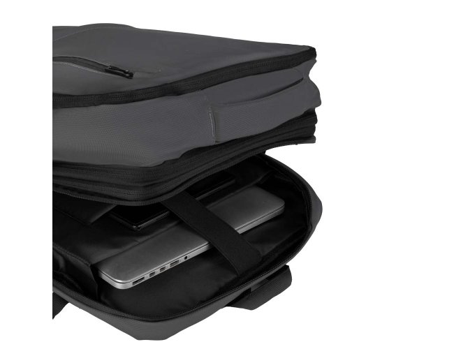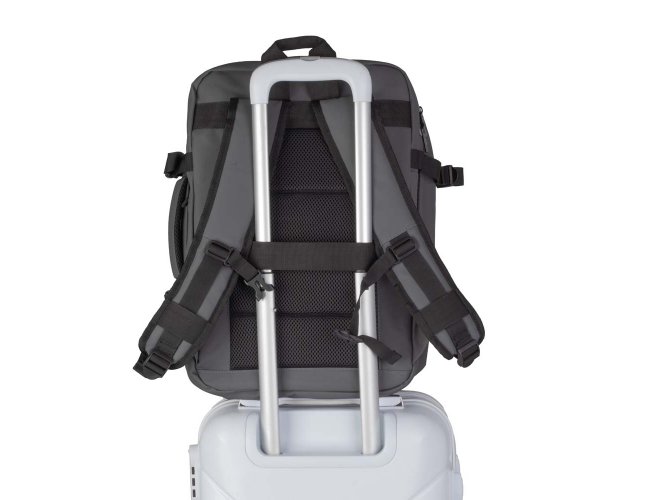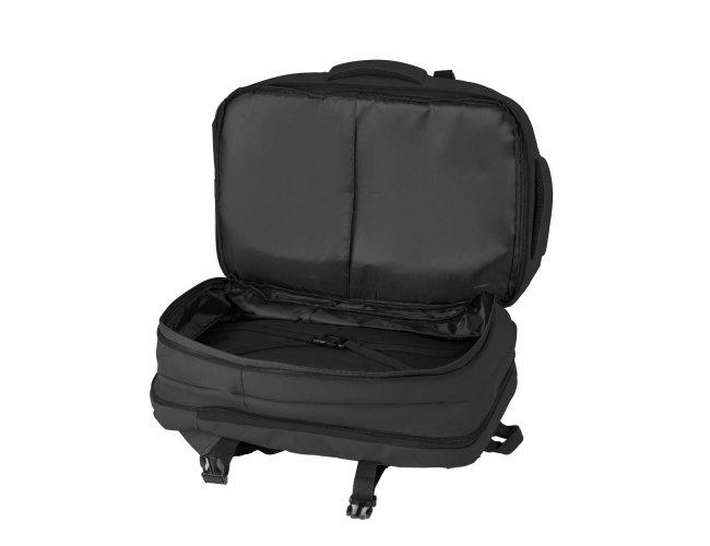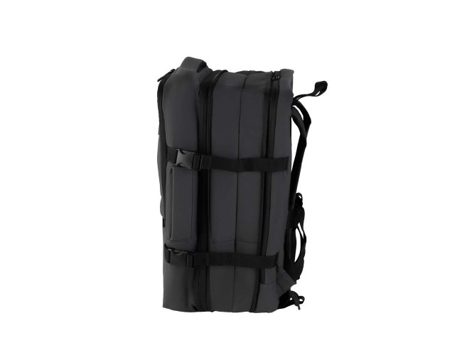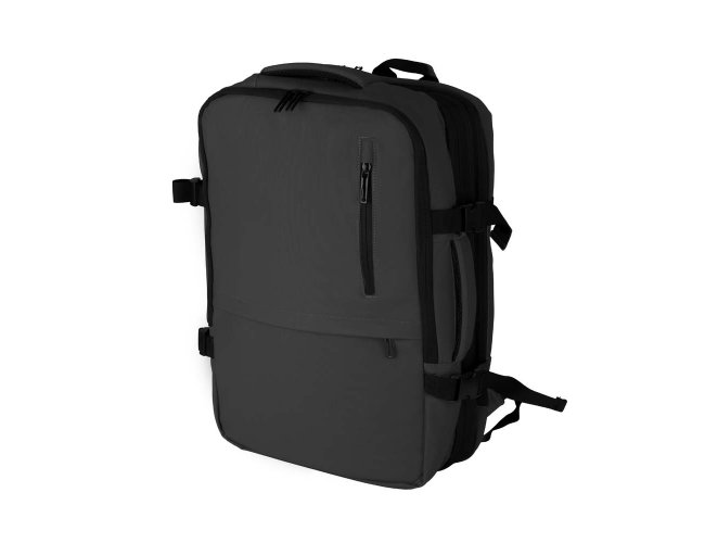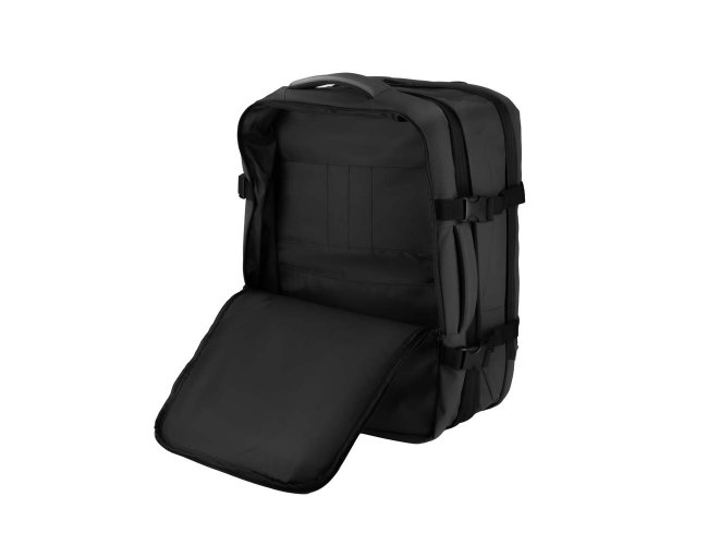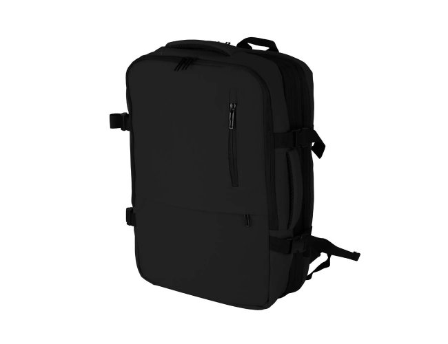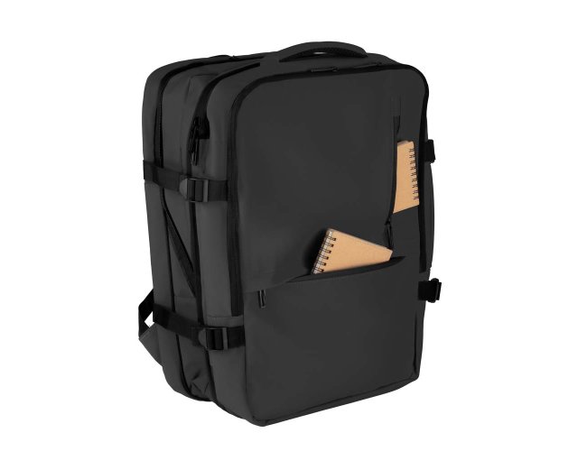 Mochila Pasta confeccionada em poliéster 600D resinado, com dois bolsos frontais e expansor. Possui três engates rápidos, engate para mala de viagem, além de alças de mão e de ombro acolchoadas para maior conforto. Conta com dois compartimentos internos para pequenos objetos, tablet e notebook de até 15,6”, além de elástico interno para manter as roupas no lugar.