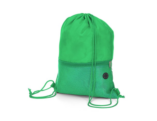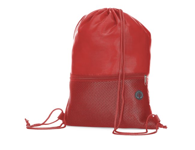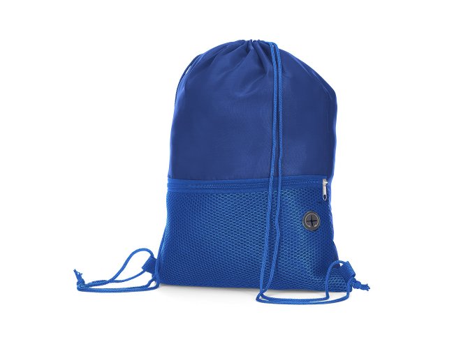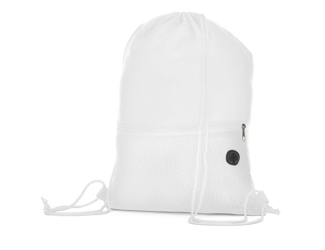 Sacola/Mochila em tecido poliéster 210D com bolso frontal com zíper.