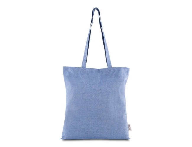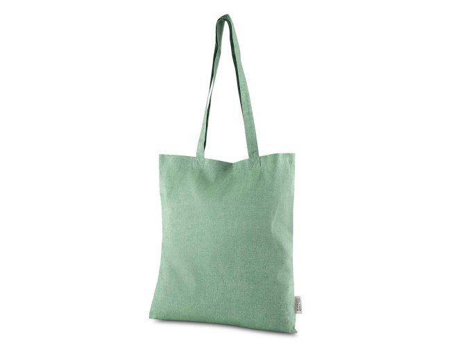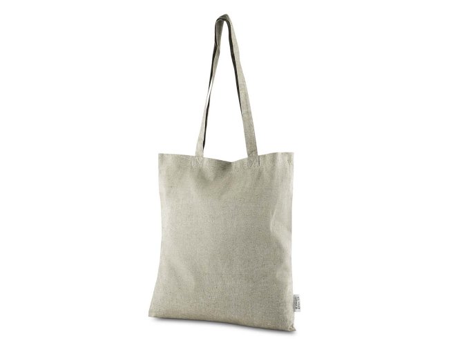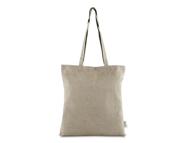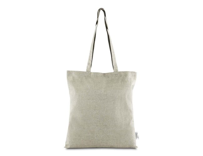 Sacola confeccionada em algodão mescla reciclado, gramatura 140 g/m². Possui alça de 65 cm ponta a ponta.