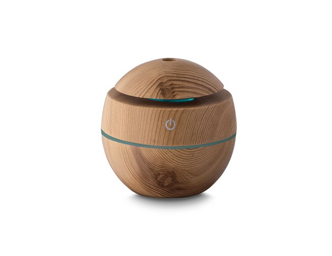 Umidificador de ar com difusor de óleo essencial à base de água via USB. Feito com ABS reciclável+ PP imitando madeira, com capacidade de 120ml. Na parte superior tem um faixa que acende, ideal para uso em escritório ou em casa.